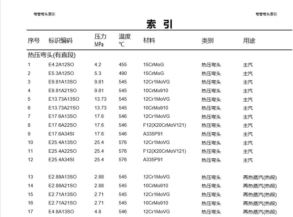 就是說不能超過455度。下面是它的一個材質,15crmog。是這樣的一個合金的材質,它的類別就是屬于熱壓彎頭。然后它的用途就是主要汽水管道。就是蒸汽或者流水的管道。而不是說這里邊走北冰洋汽水的,或者走那個西安的那種冰封汽水的這種管道,不是那種喝的汽水。再接下來呢,有那種E5.3a12so。意思也就是仿照的這個這那么走的除去除非呢壓力不一樣,然后溫度不一樣,它的這個材質也是一樣的,后面的類別和用途也都是一樣的。